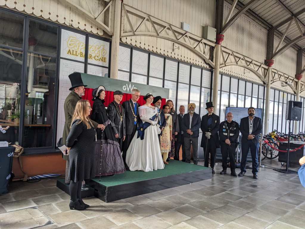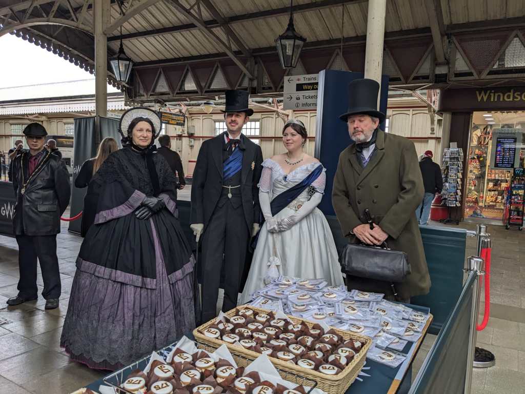 Today was the 175th anniversary of opening the first train line to Windsor. It was built in just over a year, and the Windsor-Slough line soon became the Royal Branch line. To celebrate the occasion, GWR had a small celebration at the W&E Central Station. It involved the Mayors of both RBWM and Slough, members of the local community, various societies, and GWR staff. Two TVs gave an overview of the history. Handouts and themed confectionery distributed by Victorian characters added a little sparkle to the occasion.
