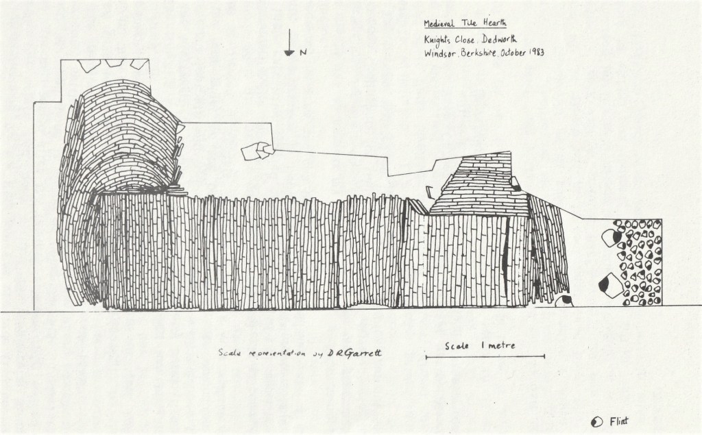 Part of a medieval hearth was unearthed at 17, Knight’s Close, Windsor, when the owner, Mr. David Garrett, was digging out the foundations for a fishpond. He reported to the writer that he had uncovered an area of tiles on edge which he felt might be of archeological interest.