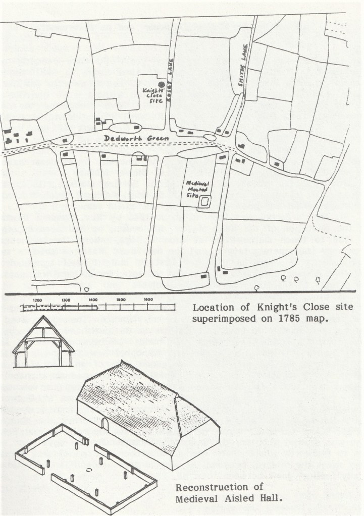 Knight’s Close now lies within the parish of Clewer but research indicates that the site was at one time located in the Domesday manor of Dedworth. In 1086, the Manor, then known as Dideorde, was held by Albert of Lotheringia for the King and was one hide (120 acres) in size. By 1200, the estate had been divided into Dedworth Maunsell and Dedworth Loring, named after the families concerned. In a deed of 1204, Dedworth Maunsell alone is stated as being one hide in size, so perhaps the Domesday settlement was increased in area. Early documents do not show the relative locations of these manors but possibly they were situated north and south of Dedworth Green, this being the bounds of the forest. In this case the building in Knight’s Close might be the site of one manor house and the excavated moated site in Wolf Lane behind Forest Road, the site of the other.