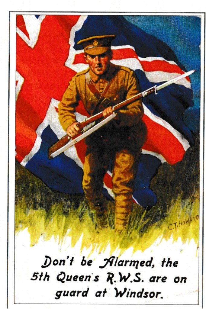 On March 1st 1915, a soldier on guard duty in Windsor sent a postcard to his young daughter Norah in Farnham, Surrey for her collection. ‘Daddie’ Langham was serving with the 5th Queen’s Royal West Surrey Regiment, and at that time was not far away from home, but what became of him, and did he make it safely back to his wife and daughter after the war?