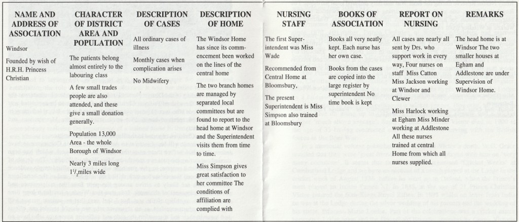 The founding of the District Nurses Fund and New Windsor Institute was the fulfilment of the wish of Princess Christian. The first nurse to be appointed was Miss Jane Wade who was 41 years old and had trained at the Royal Infirmary in Edinburgh and received her district nurse training at the Metropolitan and National Society.