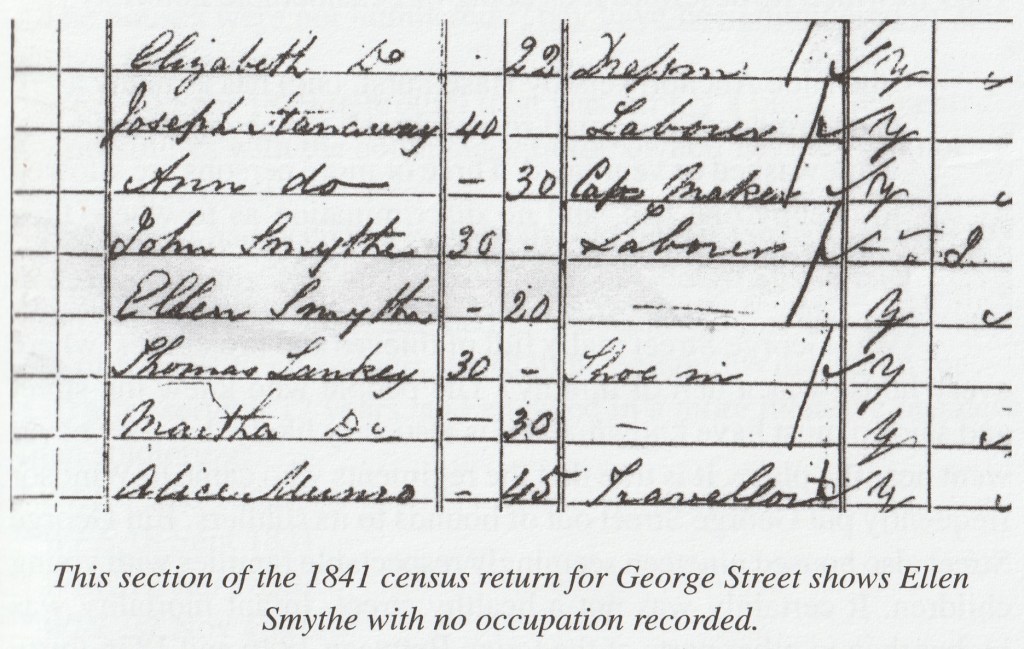 However, there are three possible candidates, Hannah Eggleton aged 15, Ellen Smythe aged 20 and Hannah Sullivan aged 16 lived at numbers 1,2, and 3 respectively. None had a job. Neither can any of the prostitutes who appeared before the magistrate, and were said to live or work in George Street be identified in census returns, except Mary Stephens and Ann Williams mentioned above. This suggests that when the census takers came to George Street, many of the hardened prostitutes made themselves scarce, perhaps to hide their identity.
