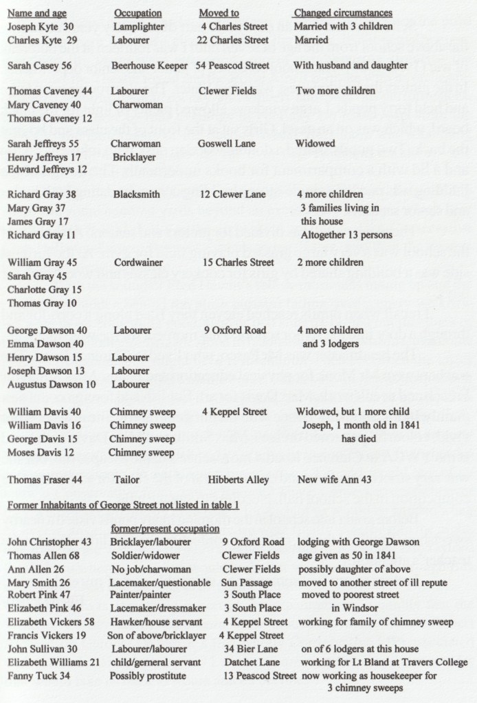 What happened to the people who lived in George Street after they were evicted in 1849? It is impossible to tell. Only 38 can be found living in Windsor ten years later, and all had moved to other areas of poor housing and overcrowding. They are listed in table 2.