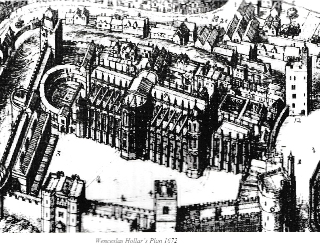 Each of these animals bears the heraldic crest of the family concerned as well as the aforementioned wind vanes. The earliest view of Windsor Castle to show the work carried out by William Vertue is by the Dutch engraver Wenceslas Hollar, and is a three-dimensional aerial plan which dates to 1672. It shows the flying buttresses, the pinnacles containing the Kings Beasts and the Lady Chapel.