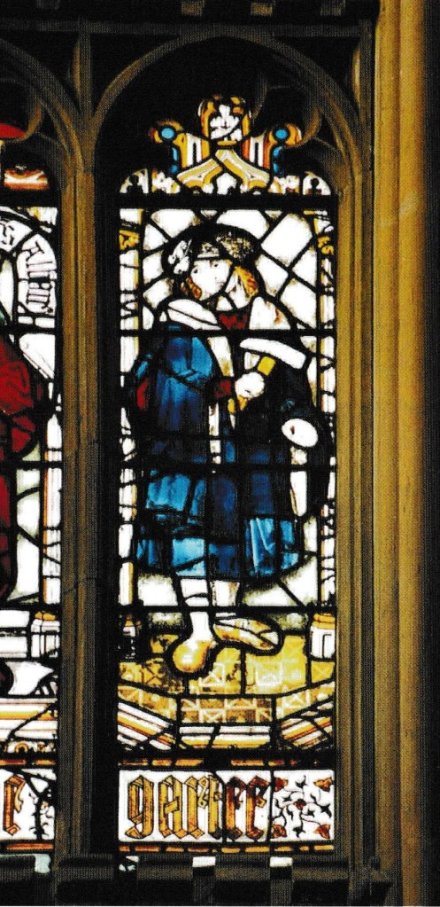 The West front of St George’s Chapel in Windsor is dominated by the great perpendicular Gothic west window, built in 1509, which depicts in stained glass a mixture of Kings, Popes and Saints. However, one person shown in this window was not of such venerable birth: this was William Vertue (f1. 1501-1527 ), the King’s Master Mason, the son of Adam Vertue, an ordinary working London mason. The window portrays the Master Mason in contemporary medieval dress, standing holding a hammer in one hand and a maul in the other. A maul was a wooden hammer which was used to set stones into position into a bed of mortar. The figure occupies the northernmost light at the bottom of the window, but its original position is unknown.