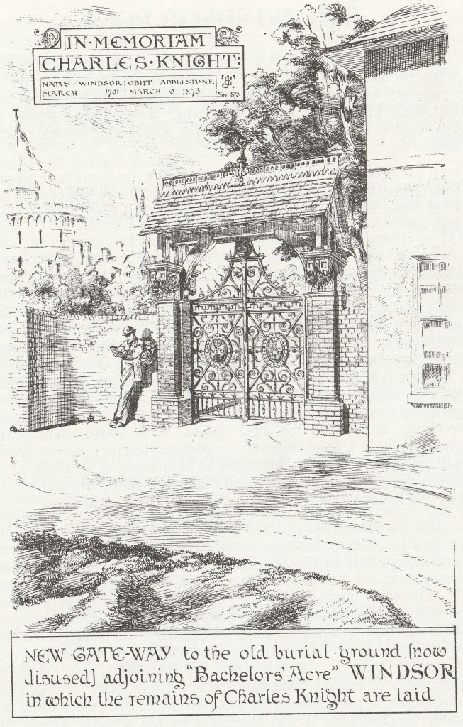 ‘Charles Knight, author and publisher, born in Windsor March 15 1791, died at Addlestone Surrey March 9 1873, and buried in his native town. His chief work through life was to bring good literature within the reach of all. This bust was presented to the Corporation of Windsor by the committee of the Charles Knight Testimonial June 14 1875’.
