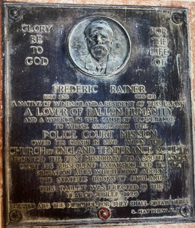Through the generosity of the Police Court Mission, to commemorate its jubilee, a medallion portrait is placed here to perpetuate the memory of the late Mr Frederic Rainer, who was the founder of this wonderful work, not that the Mission needs recommendation, but that it should serve to remind those who follow after of a man who served well his day and generation by using the talents entrusted to his keeping for the good of humanity. Gifted with sympathy and broad-mindedness on the brotherhood of man, he courageously sent a valuable suggestion and small subscription into the right channel, and the result is today a work of vital importance […] Whilst I express my thanks for the honour of unveiling this memorial, I will say in the name of those whose presence here endorses their appreciation of this timely recognition of a noble work, that we trust it will always rank in the high honour it deserves among the memorials for which Windsor is famous.