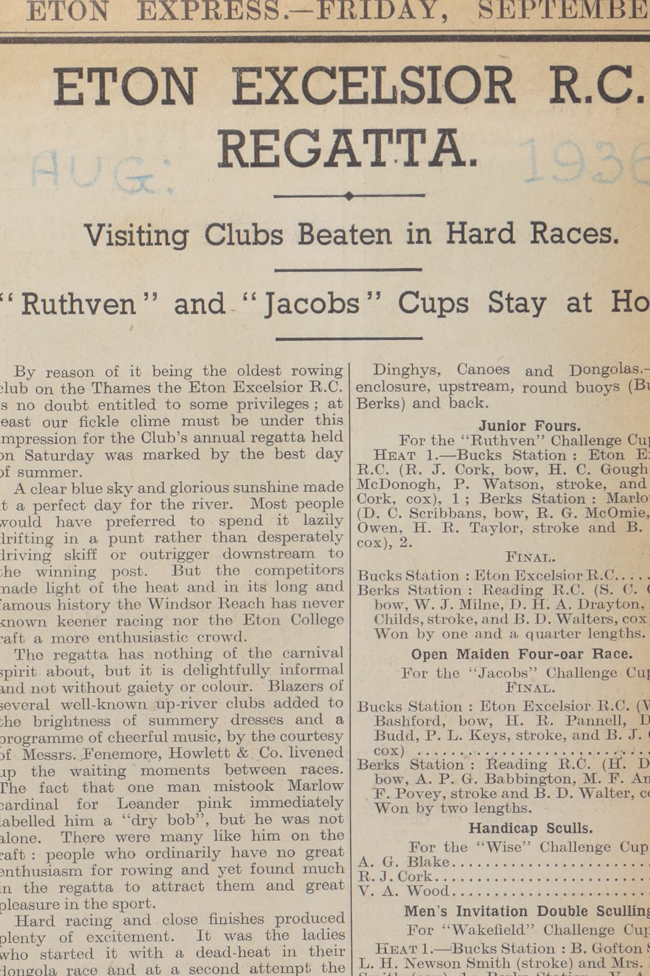 Eton Excelsior Rowing Club Newspaper Clippings Index