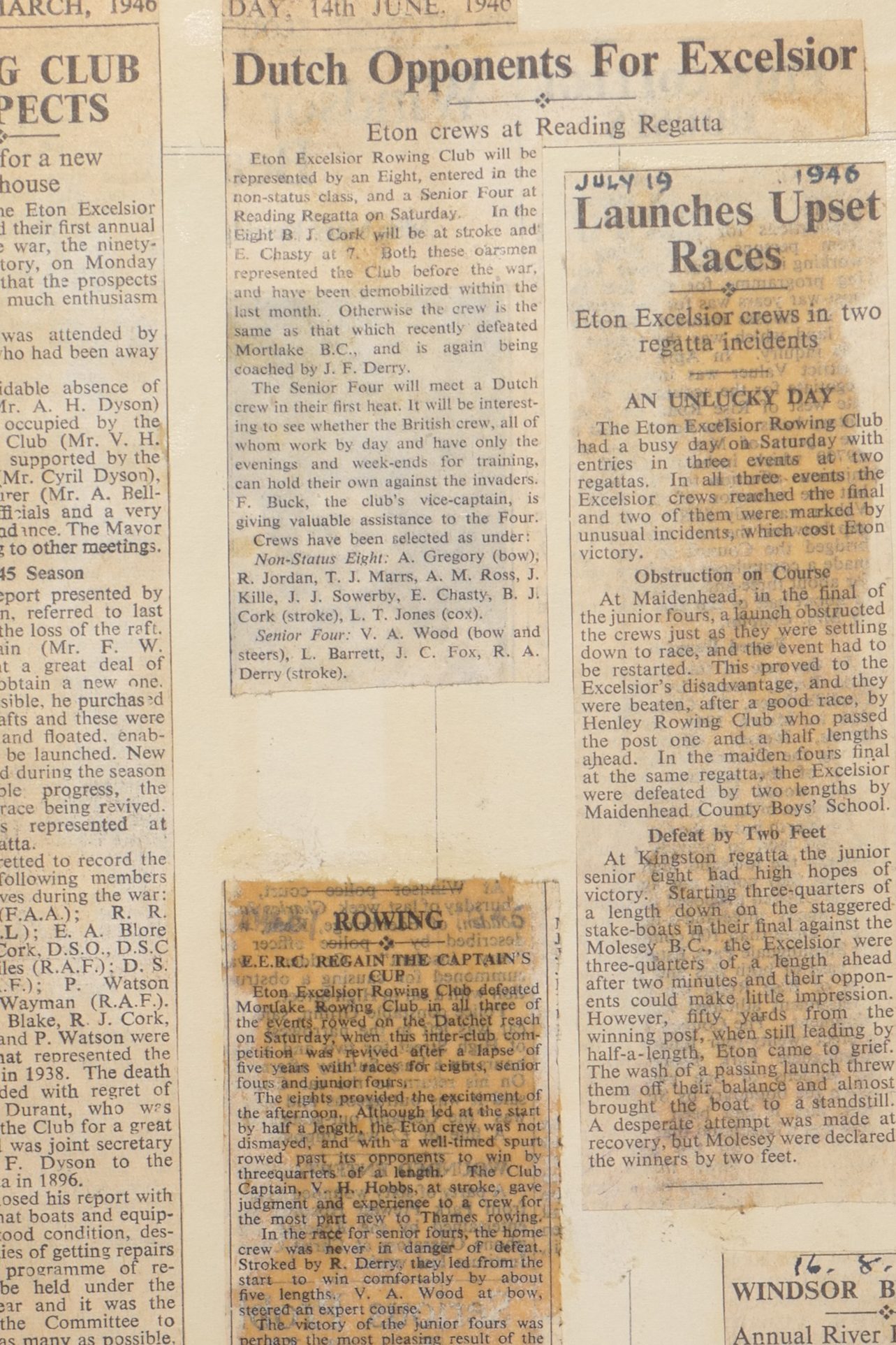 31 cuttings cover the period 1939 to 1945 and provide insights into how the club and the towns of Windsor and Eton prepared and responded to the war and how aspects of day-to-day life continued at a difficult time in World history. Events covered range from the trivial to the profound.