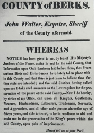 County poster calling on men over the age of 15 to be ready to aid in the suppression of the ‘Swing Riots‘ – on pain of imprisonment