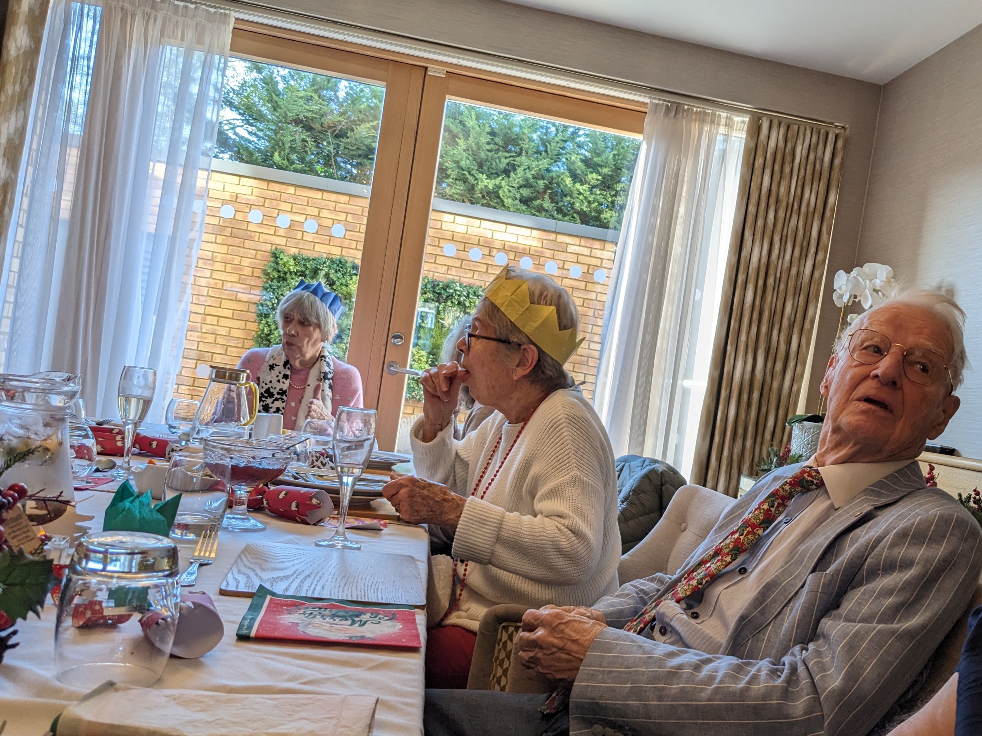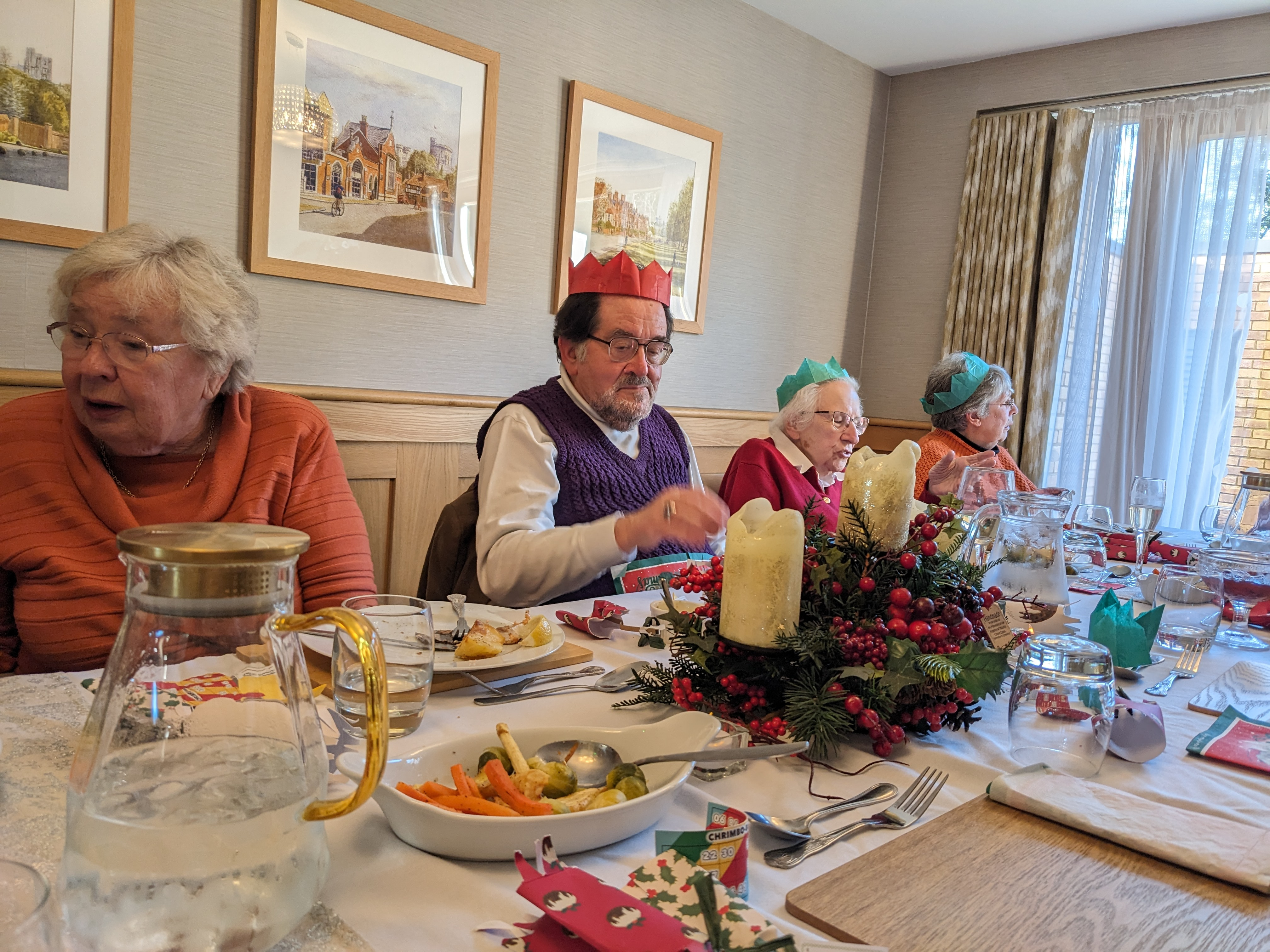 At midday, we adjourned to the Sky Lounge for Prosecco and canapes and enjoyed the wonderful views and a visit to the apartment of two of our members. Following this, the traditional meal was then served in our room, now decorated for Christmas, and we enjoyed a splendid time eating and chatting together.