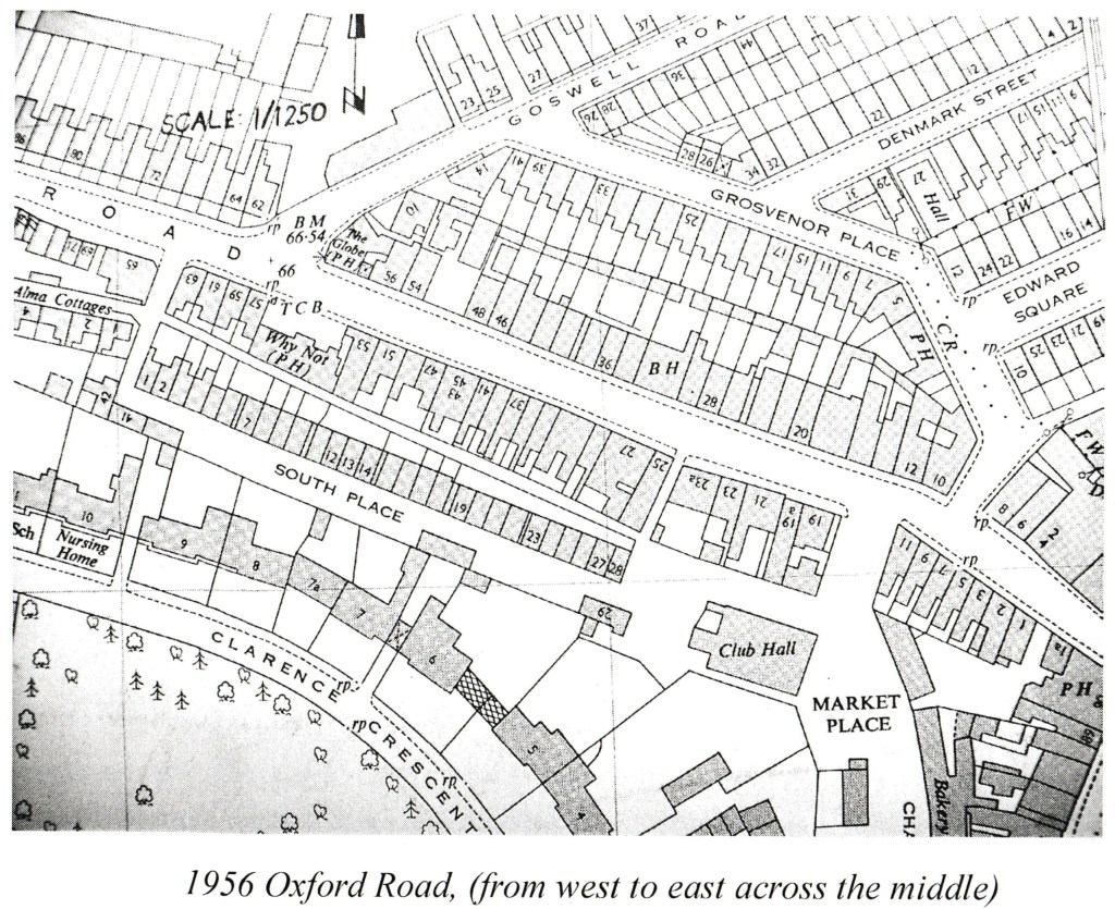 Once the railway had arrived, with the new station replacing George Street, residential building started in earnest. Terraces of houses arrived on the meadows, firstly in Gardner’s Cottages, then Victoria Cottages (Denmark Street, Edward Square and Grosvenor Place.) Others nearby included Arthur Road, Goswell Place, Bridgewater Terrace, Oxford Road, Bexley Street and Albert Street. All of these new residents needed local shops for their day-to-day requirements — butchers, bakers, grocers, hardware stores and of course, a few pubs.