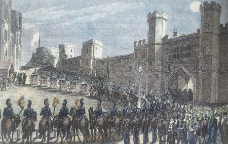Like all royal funerals at the time, Charlotte’s took place at night, and the cortège set out from Lower Lodge at 8.30 in the evening. Leopold, as Chief Mourner was supported by two of Charlotte’s uncles, the Duke of Clarence (afterwards William IV) and the Duke of York. The Prince Regent, following royal protocol, did not attend.