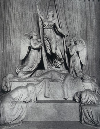 ‘The Princess, says Gunnis, lies covered by a shroud with the fingers of one limp hand protruding to macabre effect. She is attended by four completely veiled kneeling figures, while above the pitiful scene and in contrast, the Princess bursts theatrically from the open tomb and soars upwards, accompanied by two angels, one of whom carries the child’.