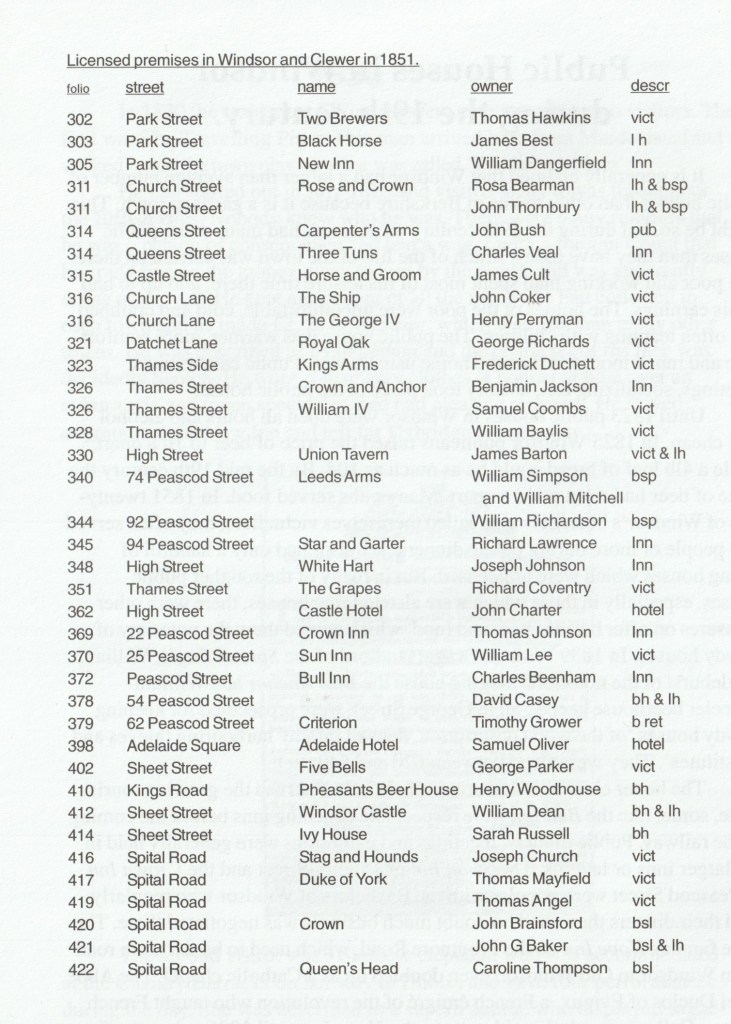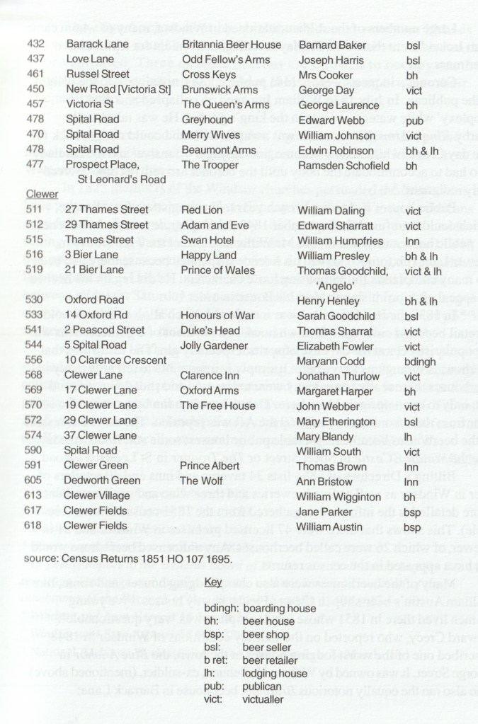 Billing’s Directory of 1854 (9) lists 34 taverns and inns and 40 retailers of beer in Windsor as well as five breweries and three wine and spirit merchants. More detailed is the information gathered from the 1851 census returns (see table). This shows that there were 47 licensed premises in Windsor and 21 in Clewer, of which 26 were called beerhouses. Any unlicensed beer-shops would not have appeared in the census returns.