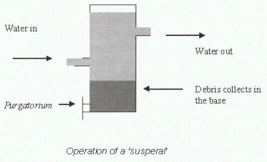 The water for the Windsor conduit system was taken from field springs immediately behind the current site of Windsor Park village, identified on Norden’s map of Windsor district as Cramborne Walk (modern Cranborne), due south of an enclosed area called ‘Suning hill parke’. The water collected would have contained sand and other debris that needed to be removed to prevent it accumulating within the pipe and creating a blockage. The method of performing this task was to insert water cleaning and inspection tank within the course of the pipe. These tanks were given different names by the various conduit designers, but in the Windsor accounts they are called ‘susspalls’; in other systems they have been called suspirel, suspirale, cesperill, spurgel, spurgella or spurgellum.(1) Suspirals worked rather like settling tanks, where water would flow into a sealed chamber through a pipe approximately half way up one side, with clean water being drawn off by an exit pipe on the top of the opposite side, allowing solid debris to fall to the bottom which was subsequently removed either by hand or by a special flushing valve — known as a purgatorium.