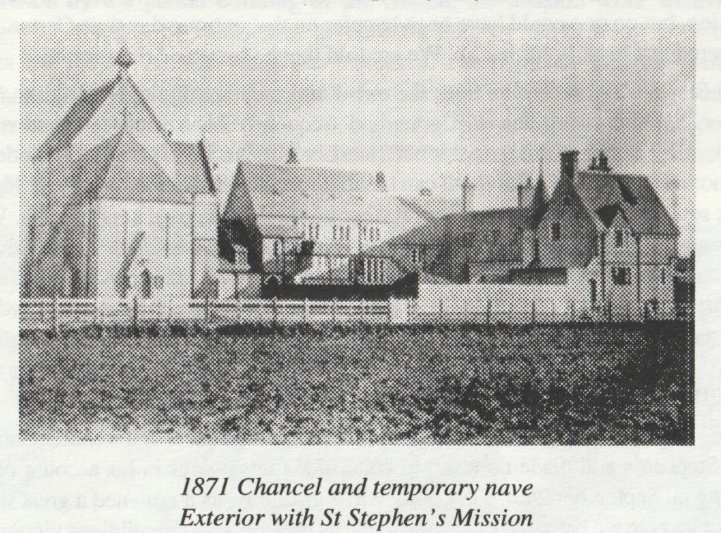 On Thursday, October 29th 1868, St Stephen’s Mission was formally dedicated. The upper schoolroom had been made into a chapel until a separate church could be erected, and an early photograph shows an altar standing on three steps adorned with brass cross, candles and vases of flowers, with an embroidered frontal overlaid with lace. A screen separated the sanctuary from the rest of the room, and two embroidered banners stood at either end of it. The dedication service was impressive and was carried out with much high church ceremonial. At 8.45. a.m. Carter blessed all the sacred furnishings i.e. chalice, paten, candlesticks, vestments and linen. Then six boys from Bell Farm school in the parish, clad in cassocks and surplices led the procession as it made its way throughout the building, before returning to the chapel. At the Holy Communion service which followed, linen vestments were worn, Carter being the celebrant with Nicholas acting as deacon and another curate (R. J. Ives) as sub-deacon. About 40 people received Holy Communion “‘poor as well as rich” so Nicholas tells us. In the afternoon the poor of the district were given tea and cake, and by all accounts it was quite a party with about 200 children, 40 regular attenders of the Mothers’ Meeting and 18 girls from the Friendly Society.