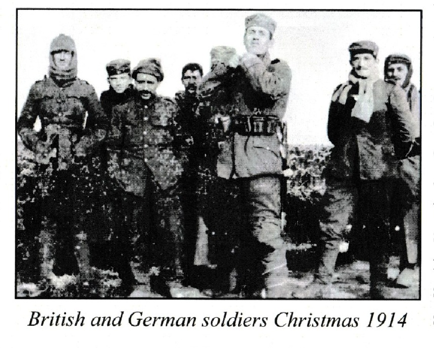 The next morning… I saw all the Germans on top of their trenches. Naturally enough we did the same and shouted greetings to } one another. Several Germans came over to our lines and stopped about 20 yards from our wire entanglements, and several officers of ‘ours’ met them. The Germans stood to attention and British and German soldiers Christmas 1914 saluted, and then shook hands.