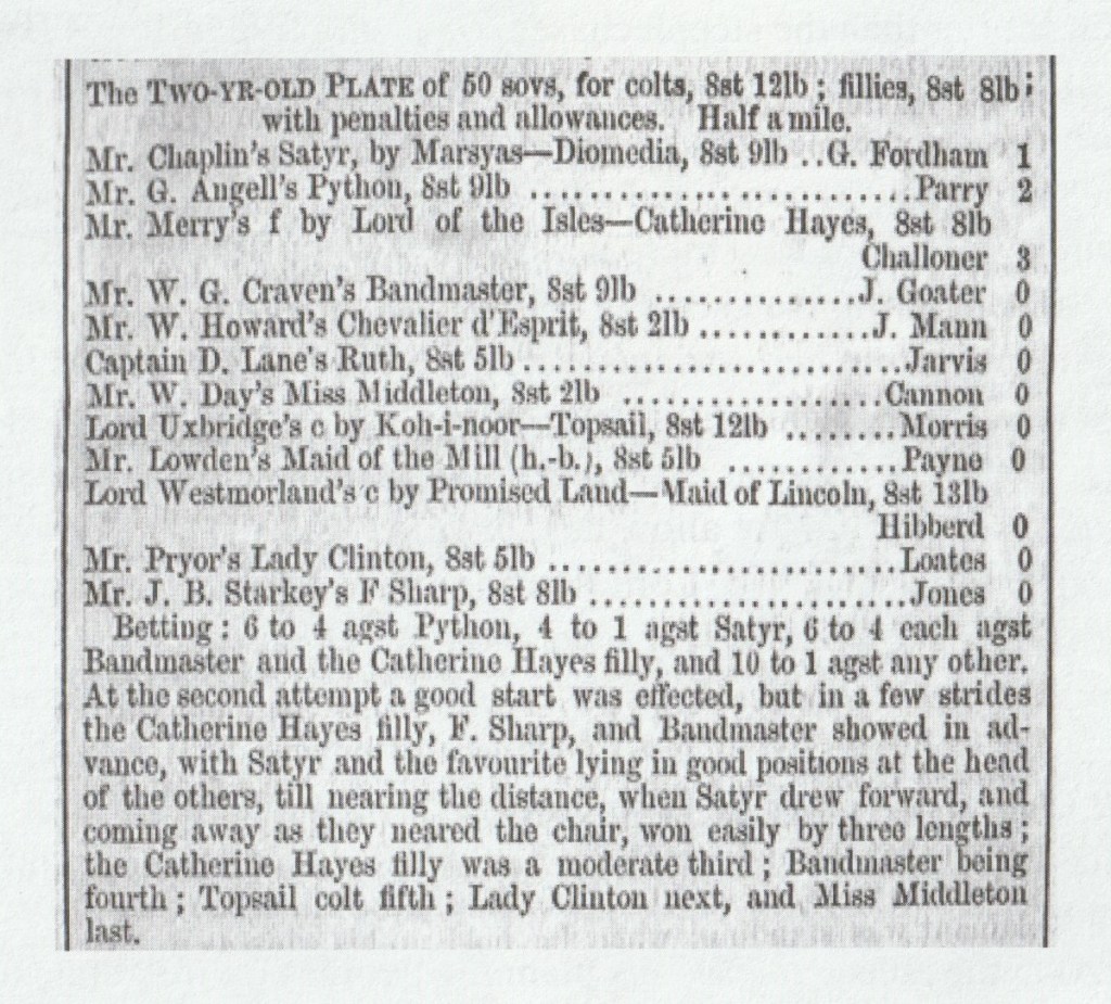 The first race was the Two-year-old Plate and it was won by Mr Chaplin’s Satyr ridden by George Fordham who was champion jockey thirteen times between 1855 and 1869, so the quality of the jockeys was the very best. Incidentally Fordham had his last ride at the Windsor course in August 1884 and then retired to Slough.