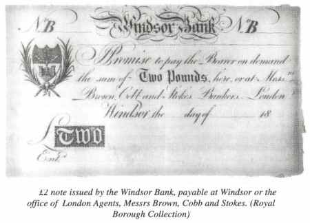 Between 1801 and 1816 Windsor had three banks, a large number for such a relatively small town; its population in 1811 was about 5,000. Two of the banks had been founded by a local ironmonger, James Coombs, in 1801. They were known as the Windsor Bank and the Windsor and Eton Bank, and it is likely that the latter was in Eton, although some bank notes were printed with Windsor as their place of issue. The third bank, also known as the Windsor Bank, was founded by Richard Ramsbottom, MP for Windsor and a local brewer, in about 1780. It was quite common at that time for more than one bank to have the same trading name, and presumably customers distinguished them by the names of the proprietors.
