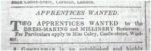 Miss Caley continued to advertise in the Windsor Express and in February 1819 she as in the need of two apprentices.