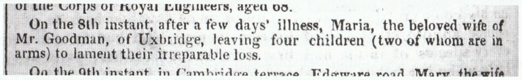 Maria died on 8th July 1834 about a month after giving birth to her only son, and she was buried at Hillingdon on 15th July. The parish register tells us that she was just 38 years old. She left four children. One would have been Emma and the others, who were baptised at St Margaret’s Uxbridge were Sarah Ann (baptised 28th January 1831), Jane (25th November 1832) and William Bellwood who was not baptised until two years after his mother’s death (1st July 1836). William and Maria also had another daughter, Charlotte Mariann who died when she was only 12 days old and was buried at Hillingdon on 20th April 1829.