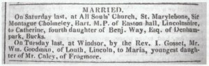 Her brother John married Mary Ann Goodman at Stamford, Lincolnshire on 4th April 1820. On 29th April of the same year an advertisement appeared using the title Mrs Caley and with a Royal Warrant as a supplier to ‘Her late Majesty’. This would be Queen Charlotte who died on 17th November 1818. The Royal Warrant had not appeared before, and I venture to suggest that it was awarded to Mary Ann Goodman before she married John Caley, as there was no Royal Warrant in Maria’s 1819 advertisement.