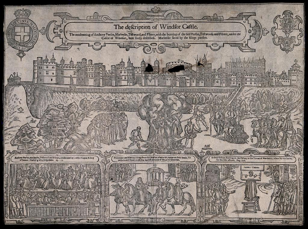 Image above: the burning at the stake of Person, Testwood and Filmer outside Windsor Castle; below, the trial of Marbeck, Testwood, Person and Filmer, the punishment of London, Simons and Robert Ockham in the pillory. Woodcut by A.S. Part of the Wellcome Collection, reference 43475i (public domain mark).
