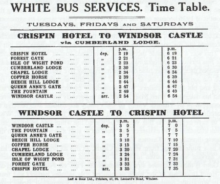 White Bus was relicensed by the Traffic Commissioners during 1933 and the following two years. There were still only four journeys along the whole route, plus a late service on early closing day and at the weekends, plus two extra journeys as far as Ascot Station.