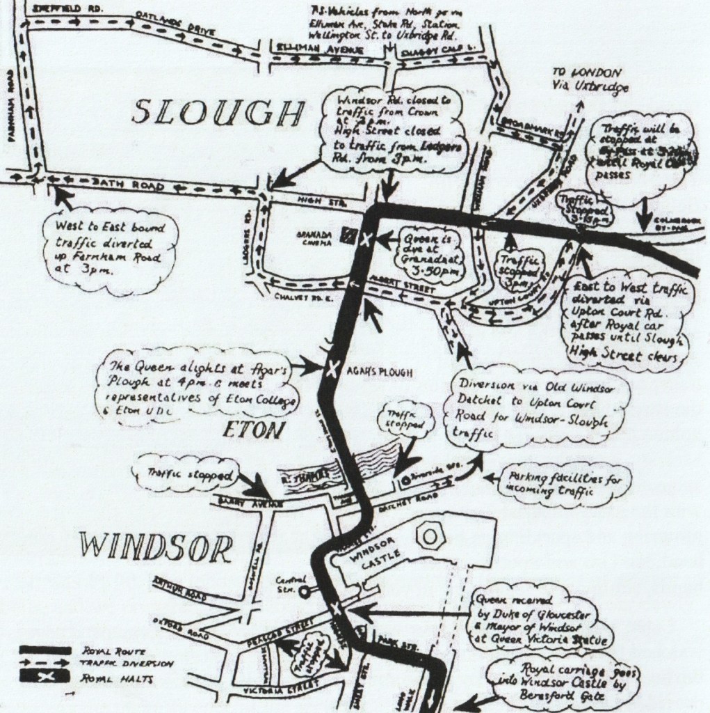 This time Slough will have greater part than in 1937, for not only will Her Majesty drive slowly through its streets, but will stop at the Granada to receive a loyal address from its Mayor. The Queen will motor from London passing through Colnbrook, and will arrive at the Granada at about 3.50. After the presentation of the address, Her Majesty will drive to Agar’s Plough.