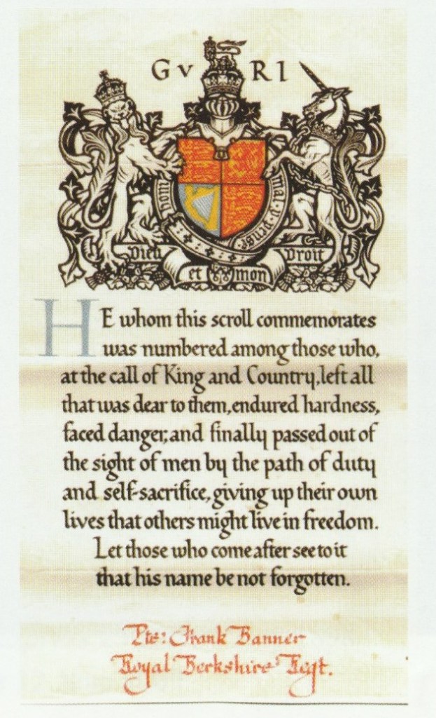 Her husband was Private Frank Banner (No 10885) of ‘D’ Company, the 5th Royal Berkshire Regiment, who had lived with F lorence at Victoria Cottage, New Road, Datchet, and was killed in action with the Expeditionary Force in France aged 25. He was subsequently buried in the Rifle House Cemetery, Ploegskert Wood, before he could witness the birth of his son who Florence named Frank after her heroic husband.
